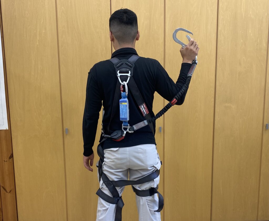 今回学んだ内容は、作業に関する知識、墜落制止用器具に関する知識、労働災害の防止に関する知識です。フルハーネスの取付方を実際に器具を用いて行いました。